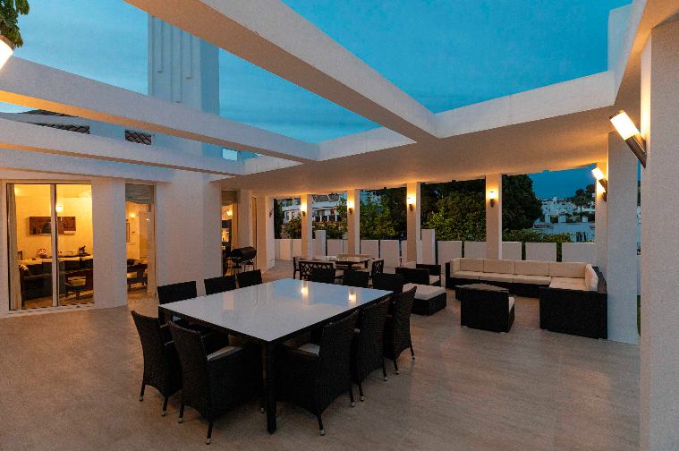 Dining Terrace: A wonderful entertaining area with several dining tables and plush, inviting sofas—ideal for evening drinks under the stars.