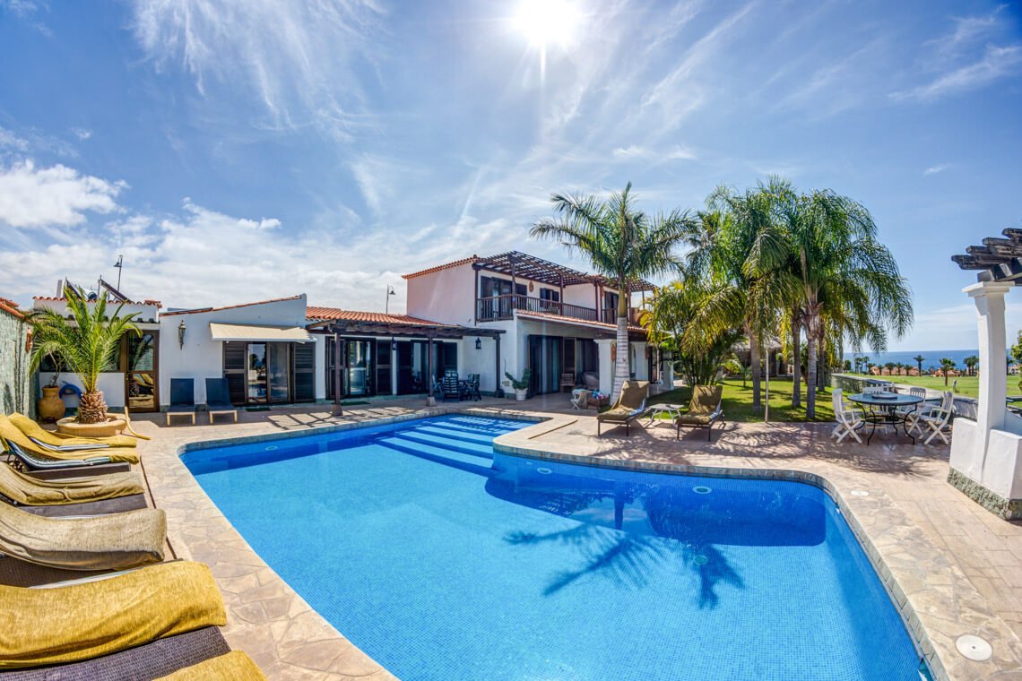 Front-line golf luxury in Tenerife South: A magnificent 6-bedroom villa featuring one of the largest heated pools on the coast, state-of-the-art kitchen technology, and a private adjoining studio flat.