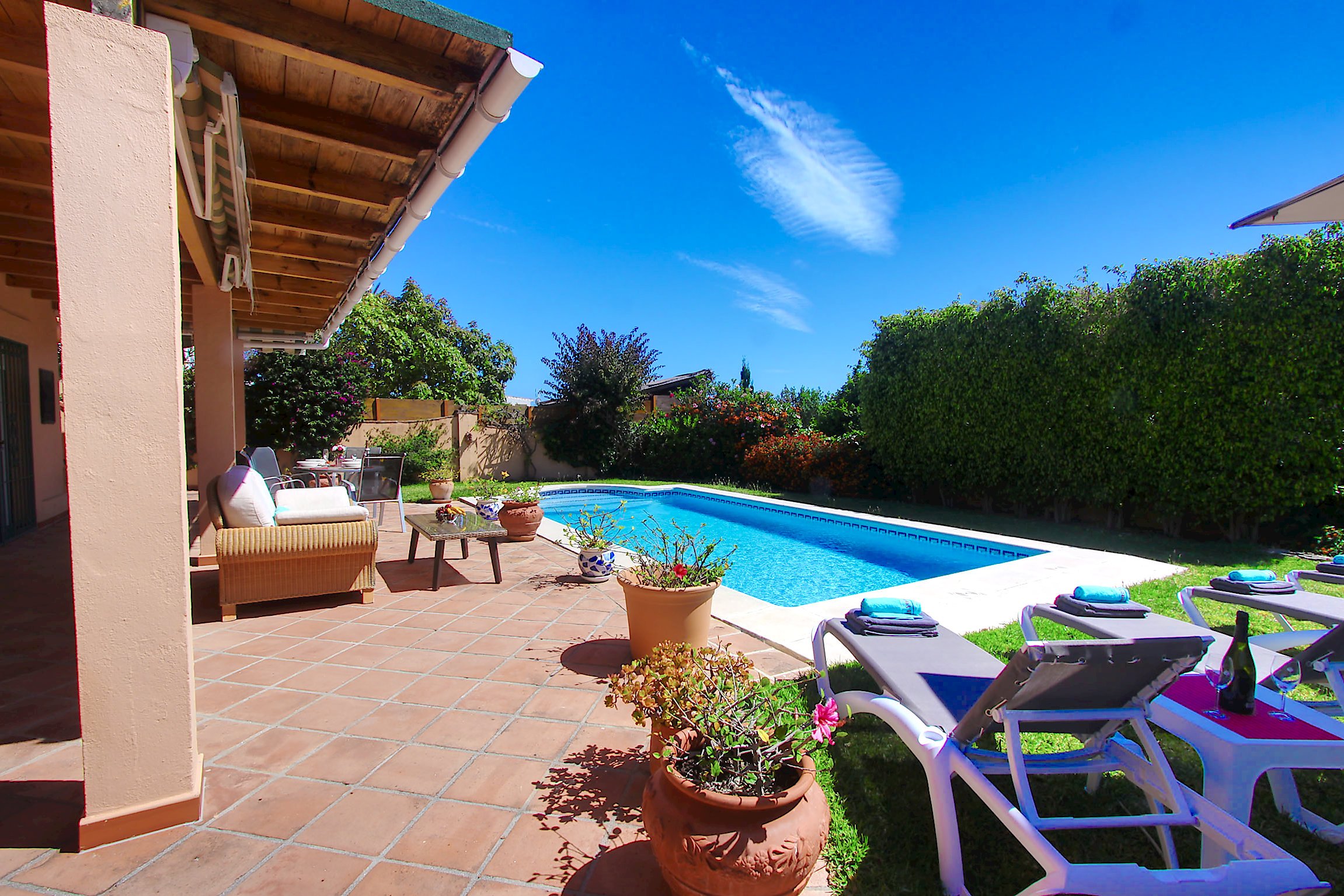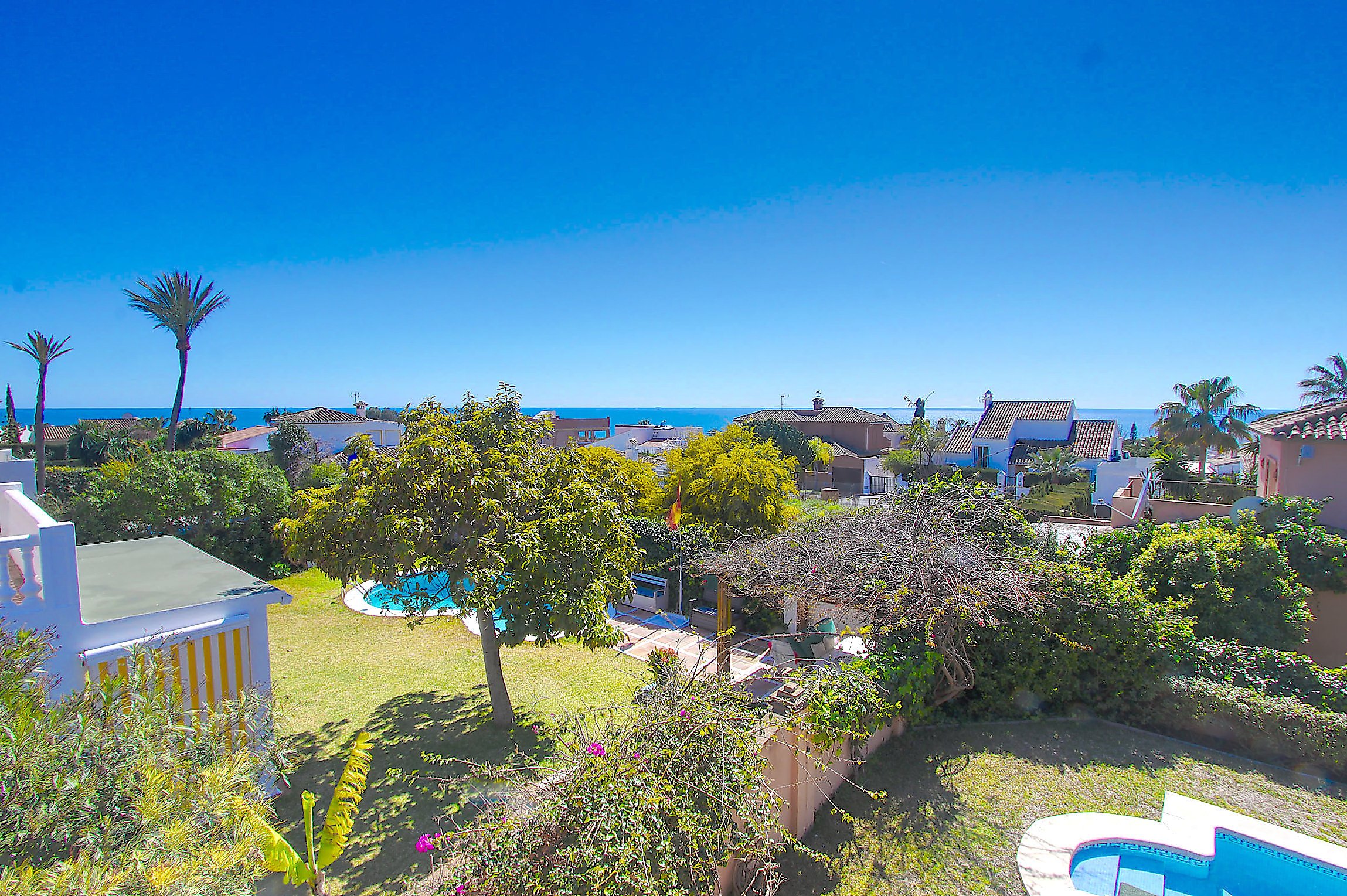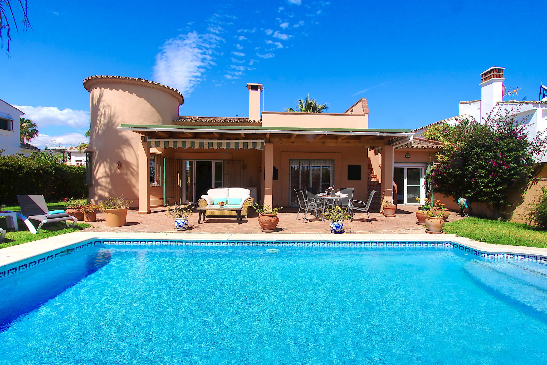 Beachside bliss in Las Chapas Playa: A cozy 3-bedroom villa with a private pool, separate guest annex, and a spectacular panoramic roof terrace just 300 meters from the Mediterranean shore.