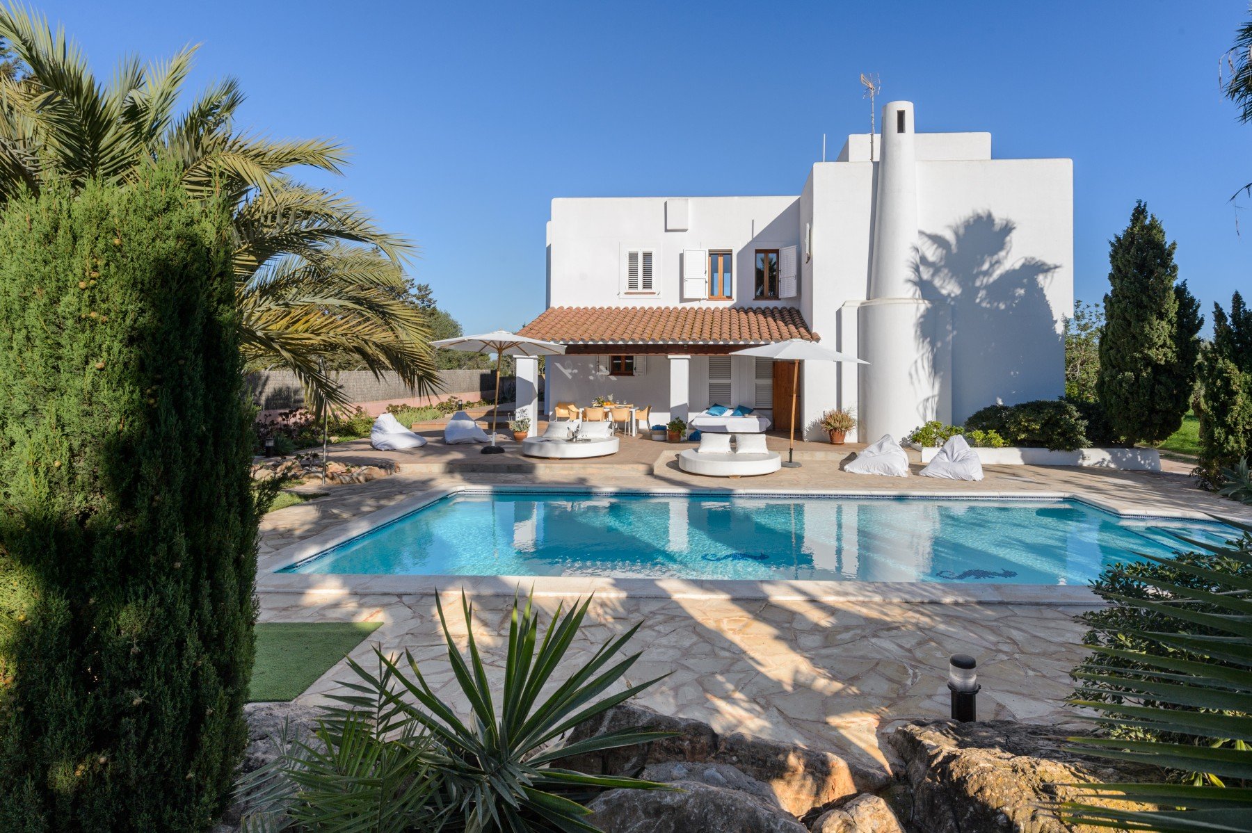 Situated in a peaceful, family-friendly neighborhood, this homely and fully equipped villa offers a rare combination of massive living space and proximity to Ibiza’s most iconic spots. With views stretching from the mountains to the sea, the property provides a serene retreat while being just a short drive from the island's best beach clubs, golf courses, and the historic charm of Ibiza Town.