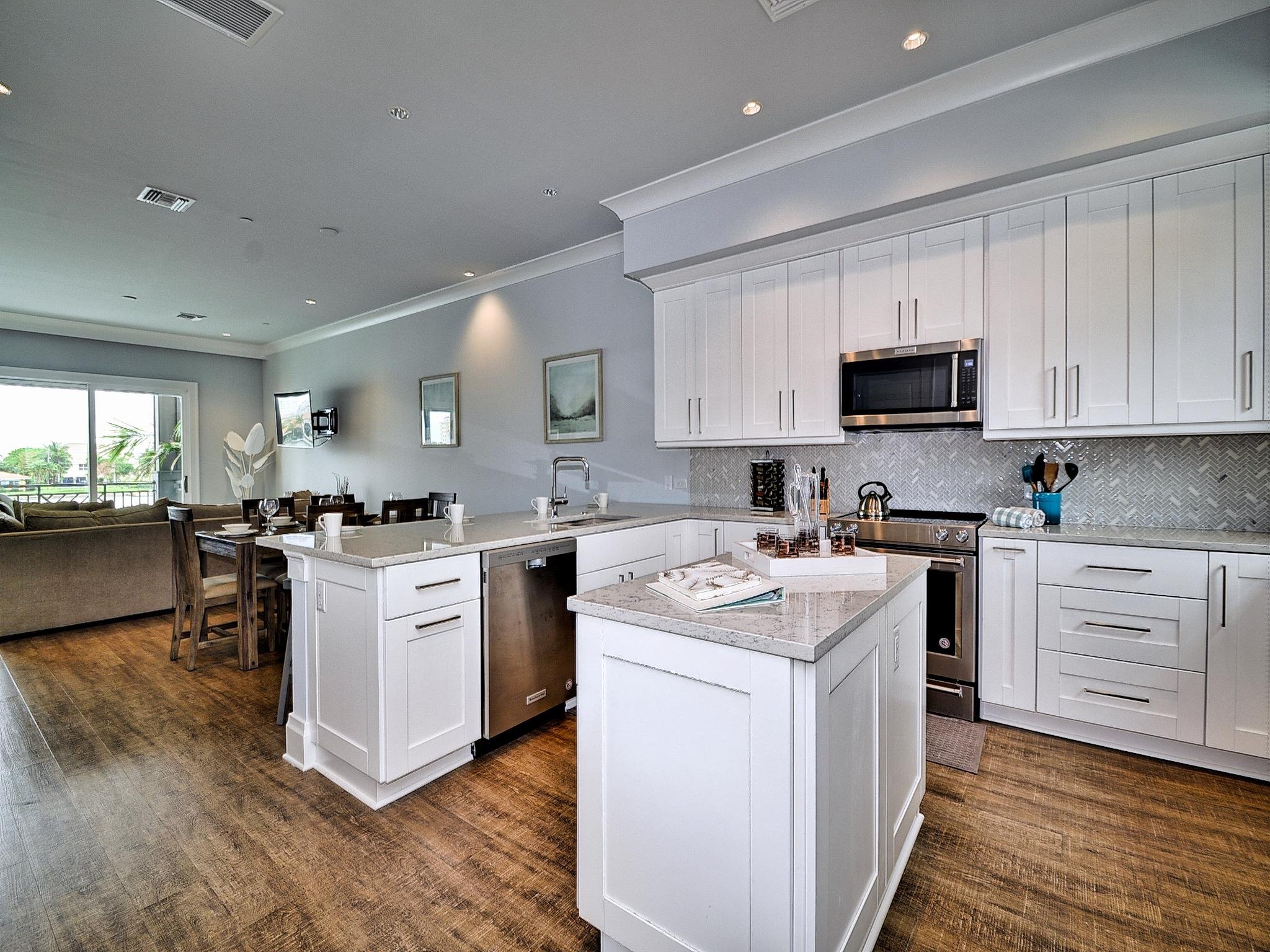 The Social Level (2nd Floor): Boasting 9-foot ceilings, this open-concept space features a fully equipped gourmet kitchen (complete with a Keurig for your morning fix), a dining area for 6, and a spacious living room with a large sectional.
