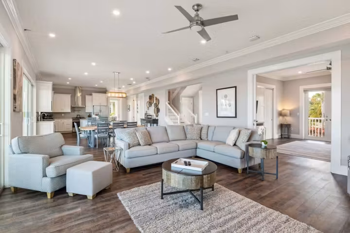 Open-Plan Elegance: The spacious living area flows naturally onto a breezy veranda, creating an indoor-outdoor harmony perfect for group gatherings.