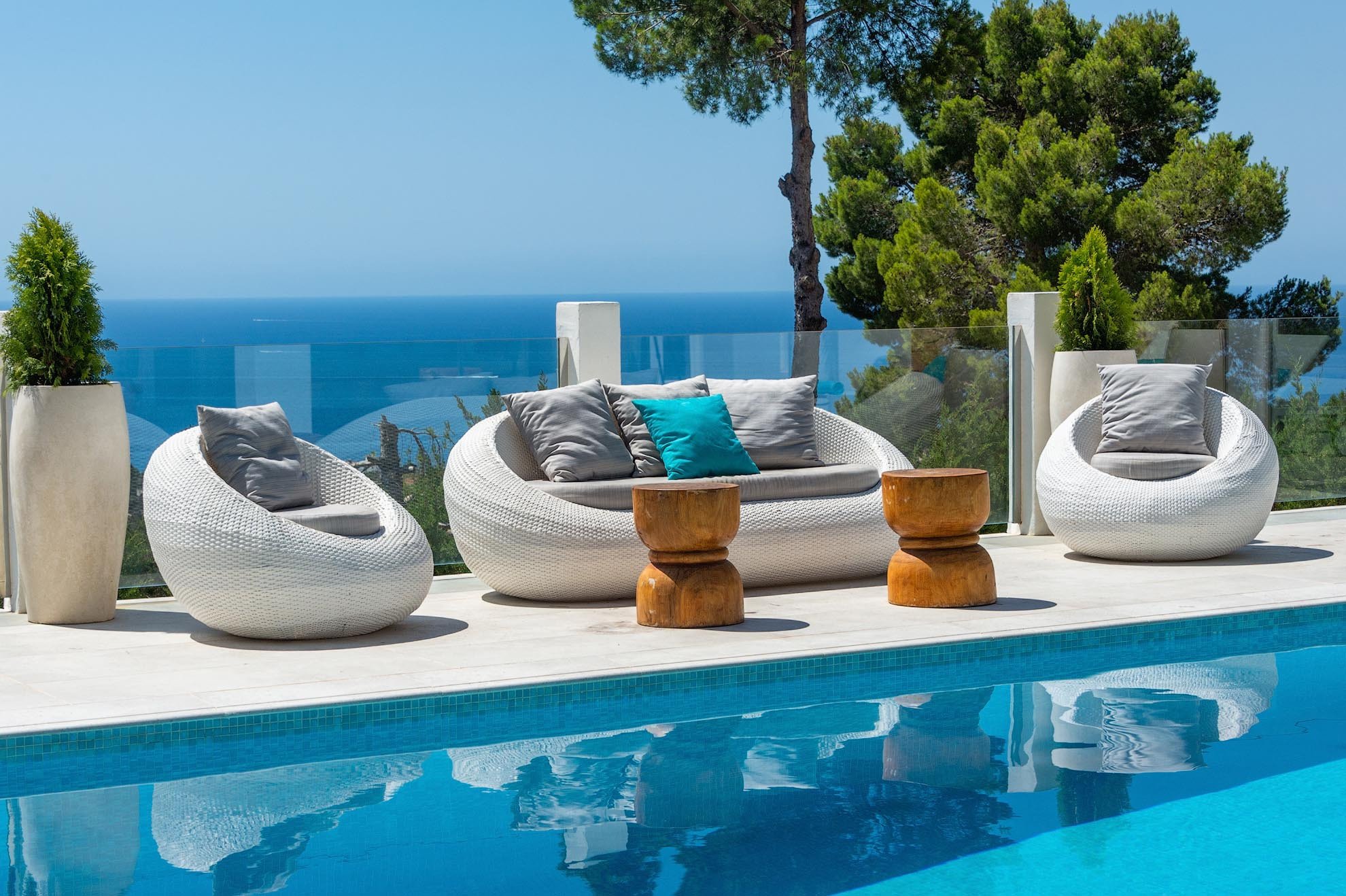 Elite living in Es Cubells: A recently renovated 5-bedroom en-suite villa perched on Ibiza's most exclusive hillside, featuring a private gym, Jacuzzi, and a dedicated children's playground.