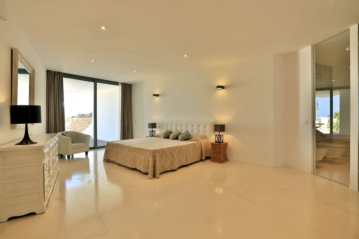 The Master Sanctuary (Top Floor): Occupying the entire upper level, the Master Suite is a world of its own. It features a king-size bed, a private dressing room, and a deluxe bathroom with a freestanding bath. The private terrace includes a custom daybed facing the sea with views of Formentera.
