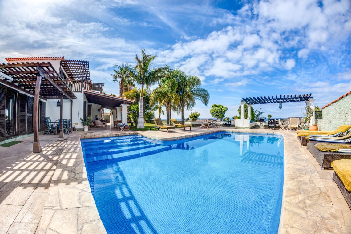 Front-line golf luxury in Tenerife South: A magnificent 6-bedroom villa featuring one of the largest heated pools on the coast, state-of-the-art kitchen technology, and a private adjoining studio flat.