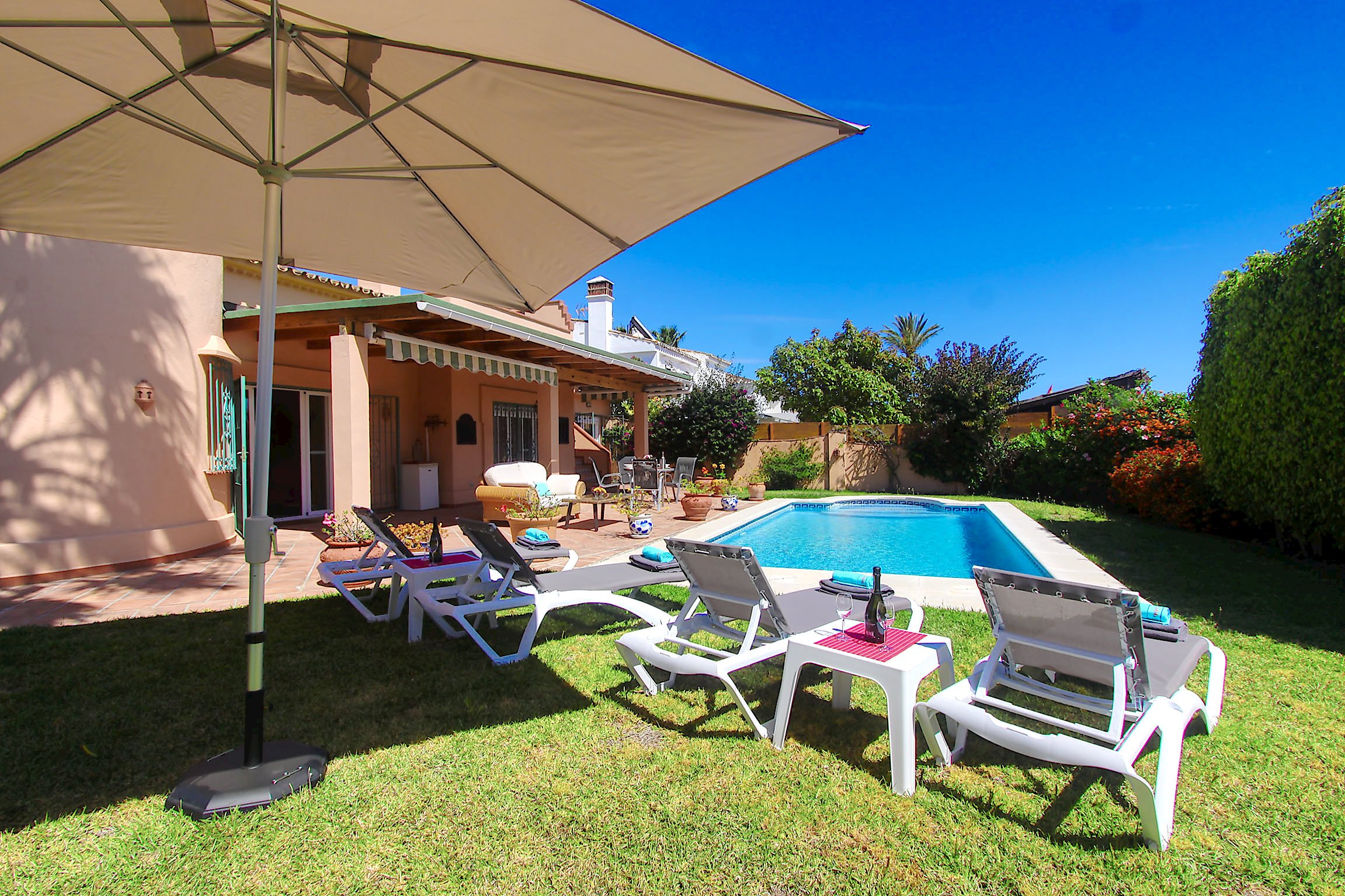 Located in the prestigious and quiet Urbanizacion Las Chapas, this charming villa is perfectly positioned for families and groups who want the best of Marbella without the need for a car. Situated on a peaceful one-way street, the property offers a private sanctuary with a cozy pool garden, while being less than a 5-minute walk from golden sandy beaches, trendy beach clubs, and essential amenities like gyms and yoga studios.