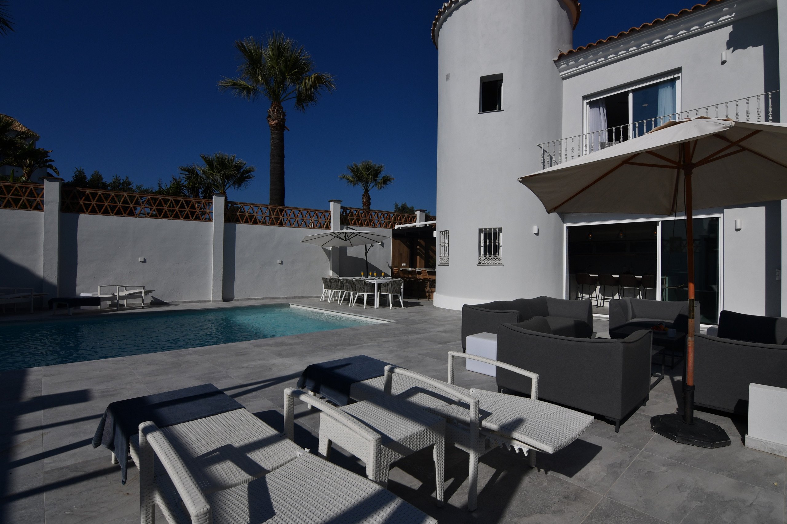 The Pool & Garden: A south-facing 8m x 4m private pool ensures sun all day long. The area is furnished with sun loungers and a large lounge bed for ultimate relaxation.